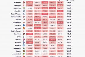 阿斯顿维拉、曼城以及水晶宫三支球队并列第三,对手平均评分均为93.3。其中,曼城的赛程尤为引人注目,他们将连续客场挑战布伦特福德和维拉,并在最后一场比赛中主场迎战利物浦。