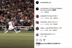 体育资讯10月2日讯 欧冠联赛阶段第2轮巴黎2-1击败巴萨,赛后巴黎后卫努诺-门德斯发文庆祝胜利。