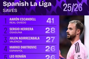 体育资讯10月7日讯 日前,Squawka统计了本赛季西甲扑救次数排行,皇家奥维耶多门将埃斯坎德尔以41次扑救居首。