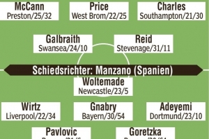 中场:斯宾塞(牛津联)、德文尼(水晶宫)、麦卡恩(普雷斯顿)、普莱斯(西布朗)、查莱斯(南安普顿)