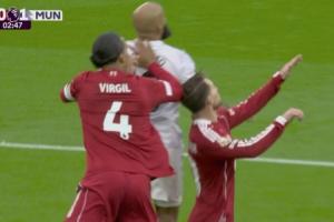 体育资讯10月19日讯 英超第8轮利物浦vs曼联,曼联先进一球,第1分钟姆伯莫破门。进球前的争顶,范迪克争顶中肘击麦卡利斯特!