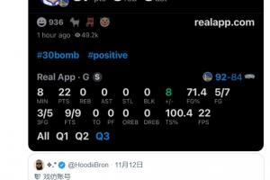 今日,体育应用Real的官方推特账号用今天的库里数据截图回击了HoodiiBron:“‘退役吧兄弟。’”