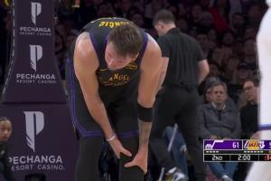 GIF-东契奇落地时被乔治压了一下!!