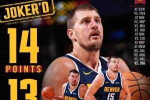 赛季至今,约基奇出场28次,拿到了14次三双。