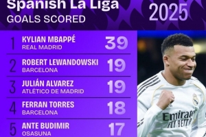 体育资讯12月30日讯 2025年接近尾声,squawka也统计了本年度西甲进球情况,姆巴佩独自断崖领跑。