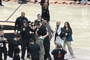 比赛结束后,绿军冠军成员、现老鹰中锋波尔津吉斯(本场因伤没有出战)拥抱了豪泽(本场命中10记三分),并与塔图姆、怀特寒暄。